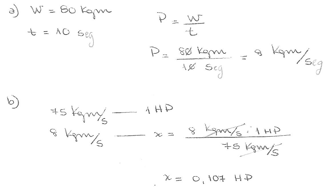 1) Si un cuerpo ha producido 80kgm de trabajo mecánico durante 10 segundos, calcular la potencia que realiza en:
