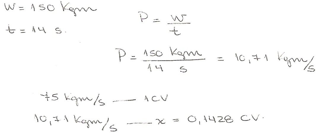 3) Un motor produce 150 kgm de trabajo mecánico durante 14 segundos, calcular la potencia realizada en CV (Caballos de Vapor).