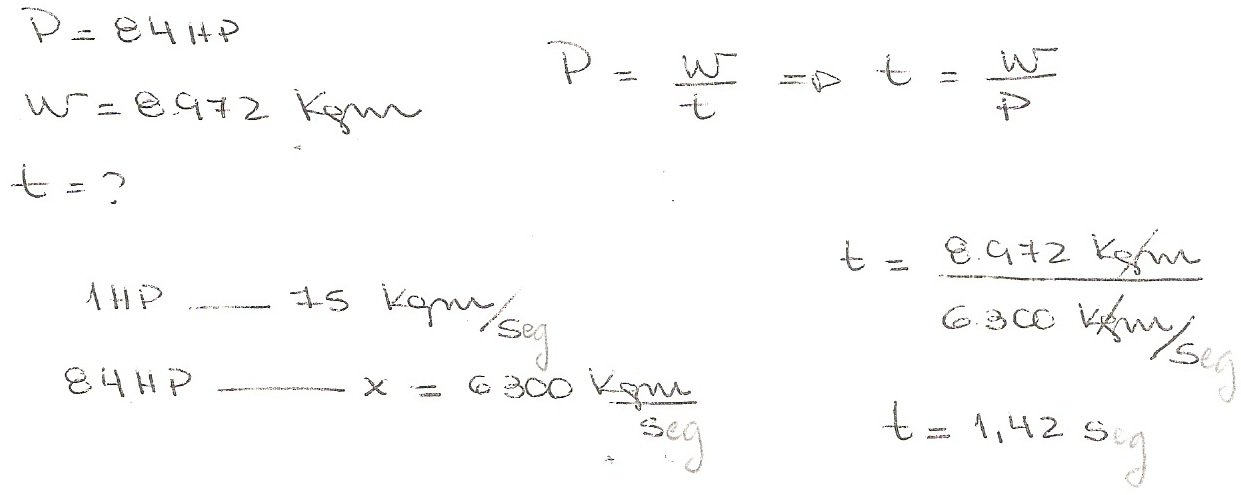5) Un tractor de 84 HP de potencia, produjo 8972 kgm de trabajo mecánico. ¿Cuánto tiempo tardó en producir dicho trabajo?
