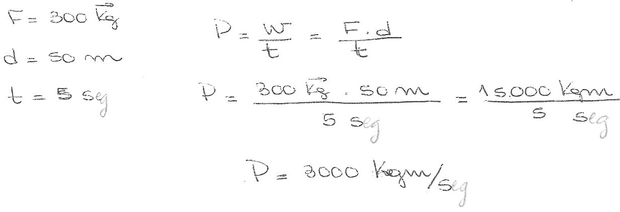 7) Hallar la potencia desarrollada por una máquina que hace una fuerza de 300 kg, al recorrer una distancia de 50 metros durante un tiempo de 5 segundos.